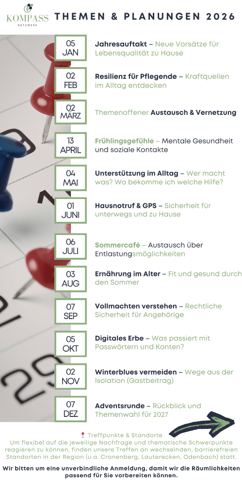 Neben unserer täglichen Arbeit mit BEN – Betreuung und Entlastungsdienst ist es uns ein Herzensanliegen, den Austausch in unserer Region zu stärken. Daher initiierte ich 2024 "KOMPASS": Eine eigenständige Selbsthilfegruppe für Senioren, hilfsbedürftige Menschen und pflegende Angehörige in Kusel, Lauterecken-Wolfstein und Umgebung.